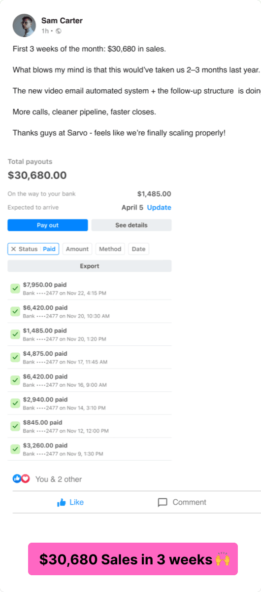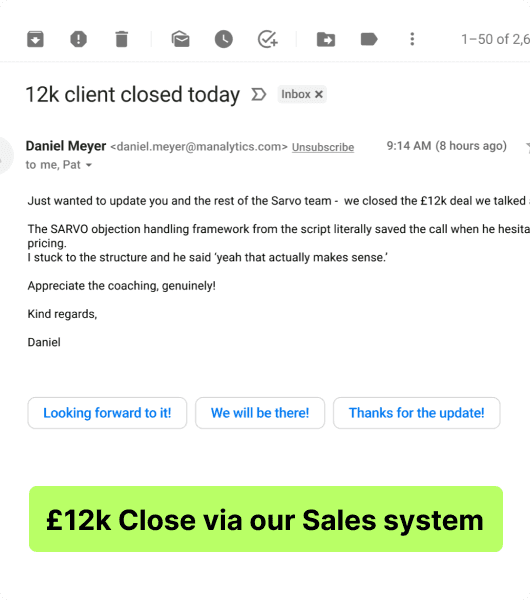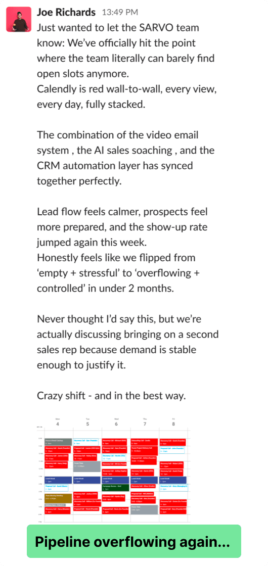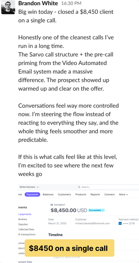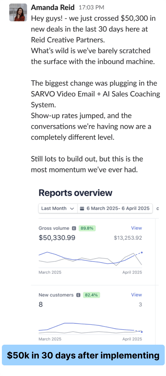This system installs an AI-powered feedback loop for your sales calls - analyzing, scoring, and coaching your team automatically after every conversation. Using SARVO’s 14-section conversion framework, each call is rated across key areas like discovery, objection handling, clarity, and close confidence, giving you instant visibility into what drives conversions.