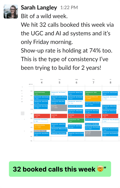 This system builds a complete paid traffic funnel that converts cold prospects into booked calls. A 90-second UGC ad, scripted and produced with professional editing, grabs attention and drives traffic to a landing page featuring a 5–6 minute VSL with the same actor and message. Prospects move from ad to opt-in to scheduling page, while automated SMS and email follow-ups recover unbooked leads.