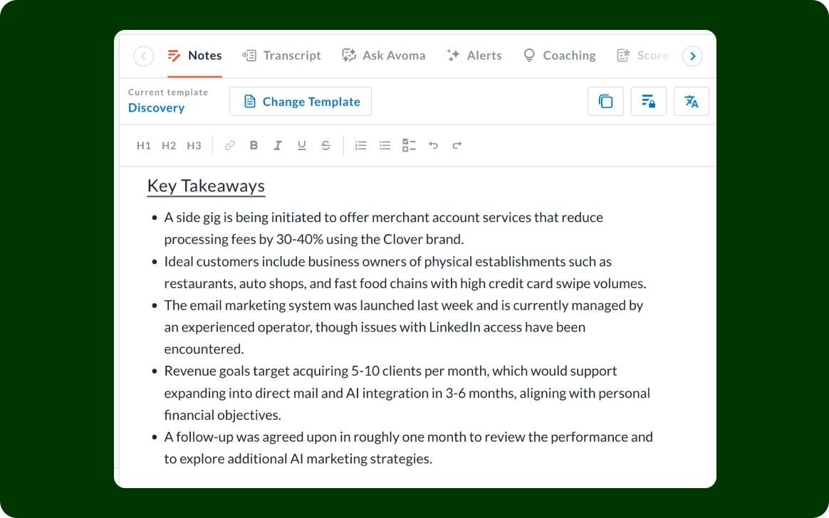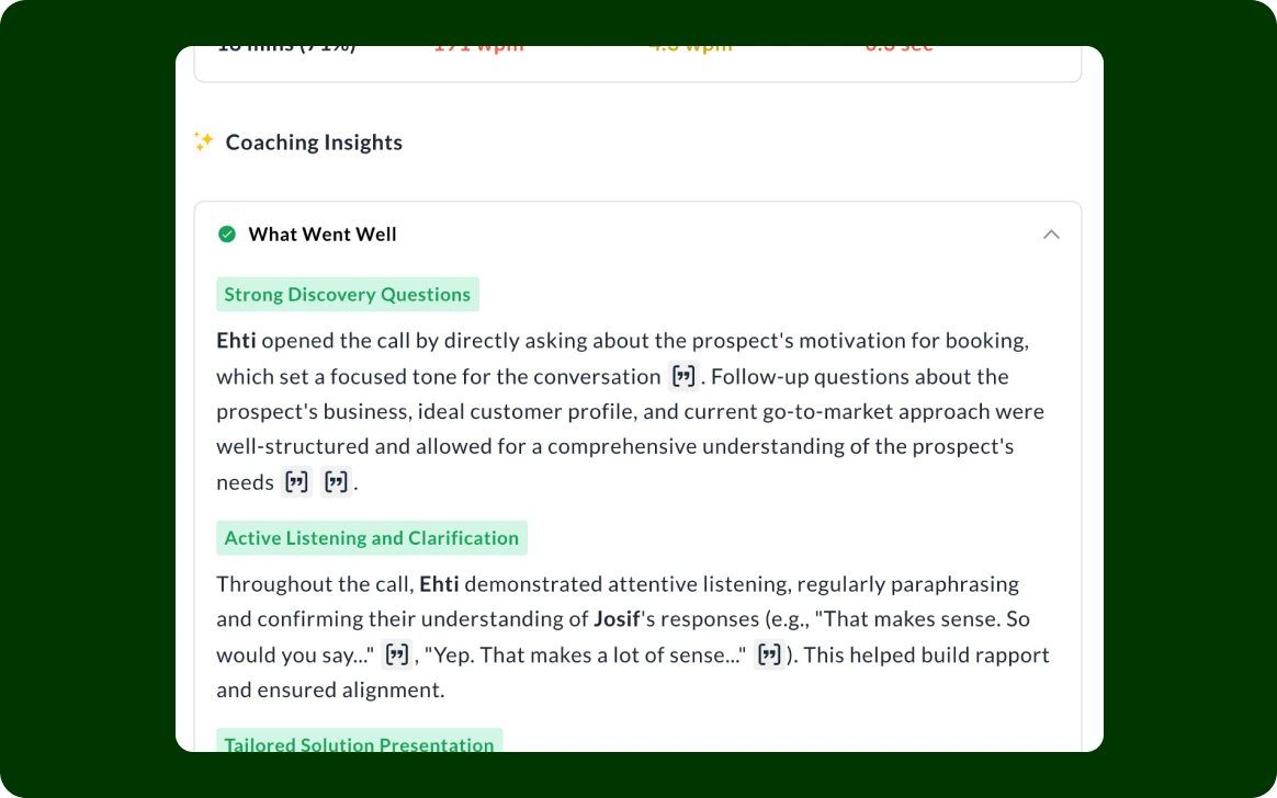 We tailor the script and scoring model to your company, upload it into your AI call analysis platform, and automate post-call summaries and performance dashboards. The result is a real-time coaching system that improves close rates, reveals performance patterns, and eliminates guesswork from sales training - all without extra management time.