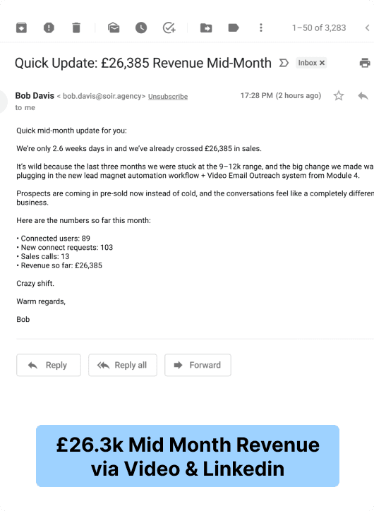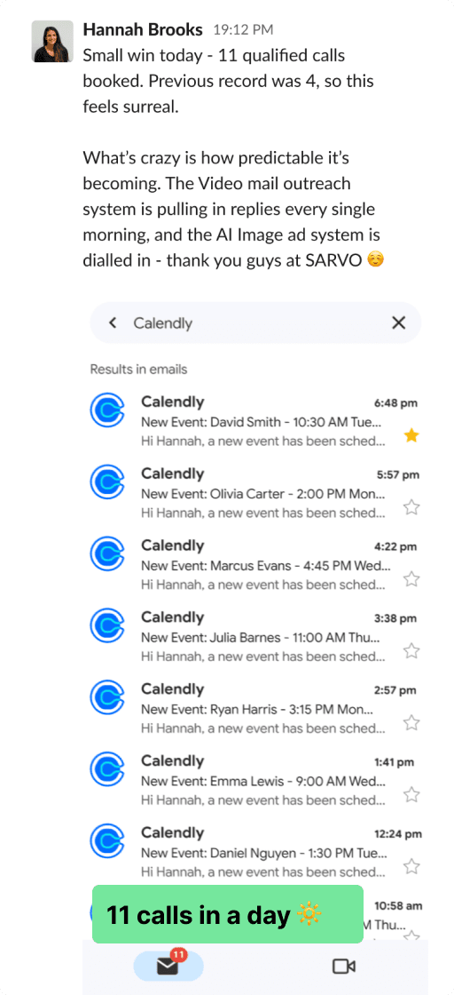 We designed and implemented a multi-touch outbound growth system - layering video email, LinkedIn prospecting, and email automation - enabling SOIR to generate qualified agency leads on autopilot, freeing up the core team for high-value delivery work.