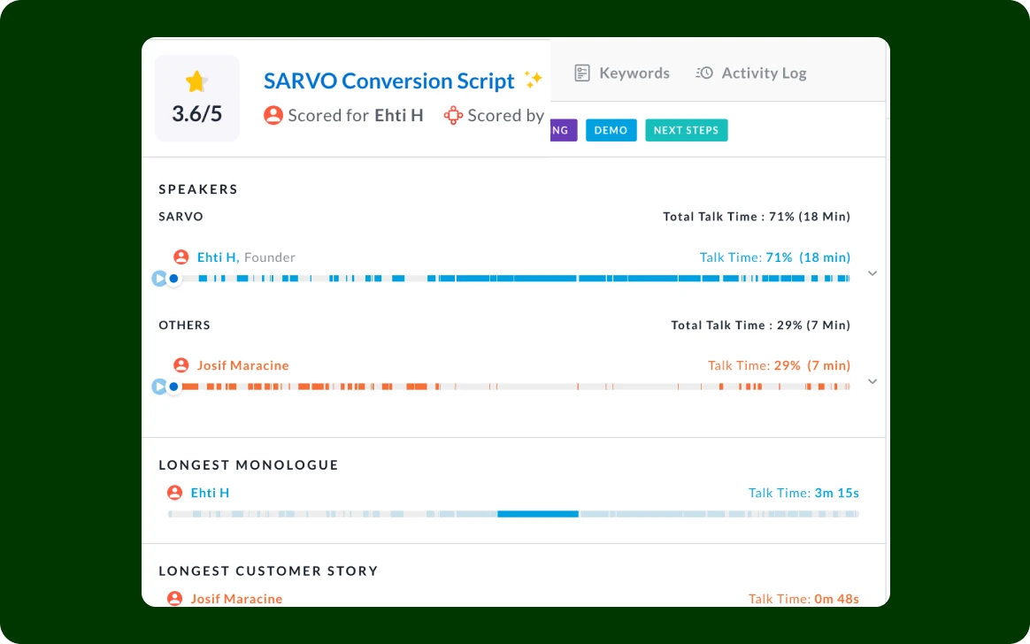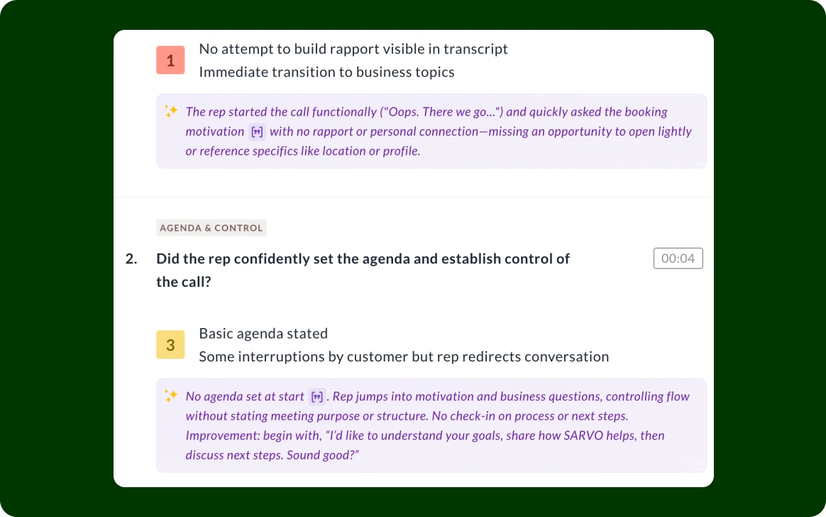 AI-analyzed and scored sales calls using SARVO’s 14-section framework