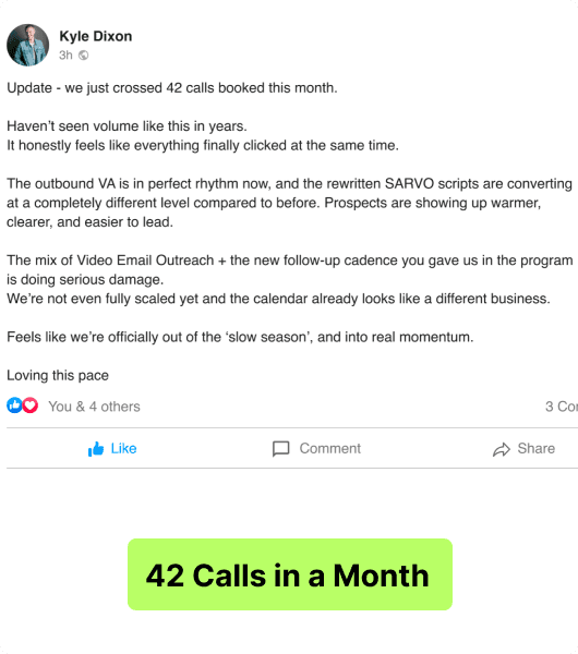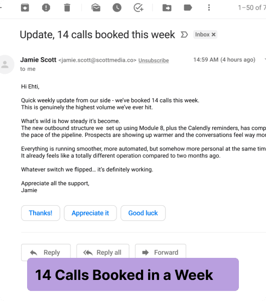With just 30 minutes a month of upkeep and 5 minutes a day reviewing replies, this system consistently delivers 10–30+ new qualified meetings every month. It’s one of the highest-ROI prospecting engines available today - once set up, it runs with almost no effort.